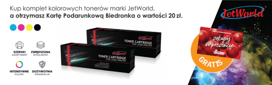 Kup komplet kolorowych tonerów marki JetWorld a otrzymasz kartę podarunkową Biedronka o wartości 20 zł.