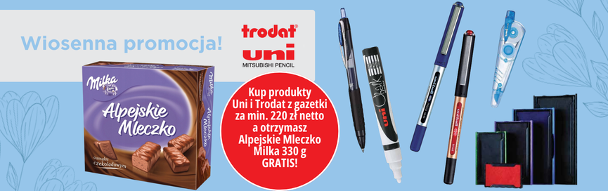 Za zakup produktów Uni i Trodat z gazetki za min. 220 zł netto otrzymasz Alpejskie mleczko Milka 330 g GRATIS!