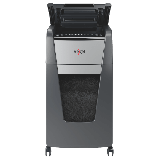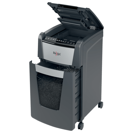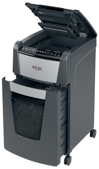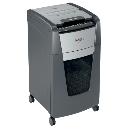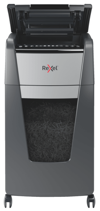 - jednorazowo niszczy automatycznie do 300 kartek A4 (80 gsm), tnąc arkusze na konfetti (o wymiarach 4 x 26 mm), co zapewnia poziom bezpieczeństwa P-4