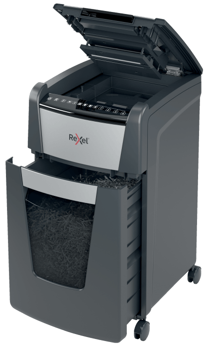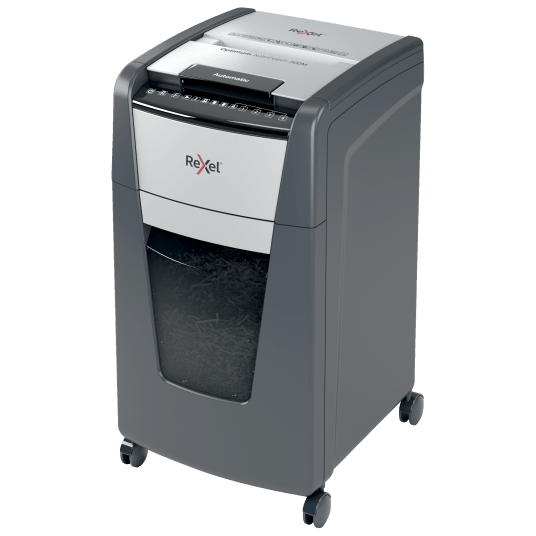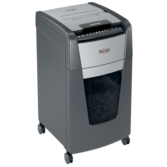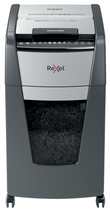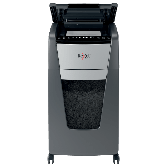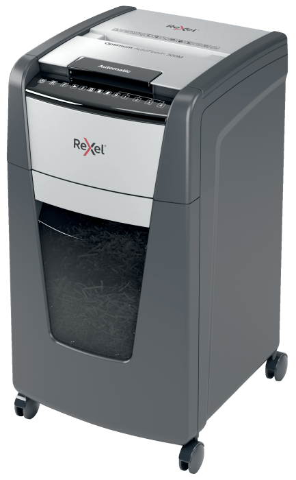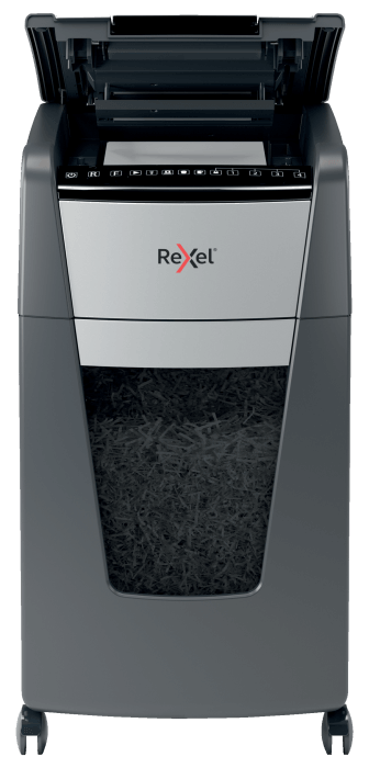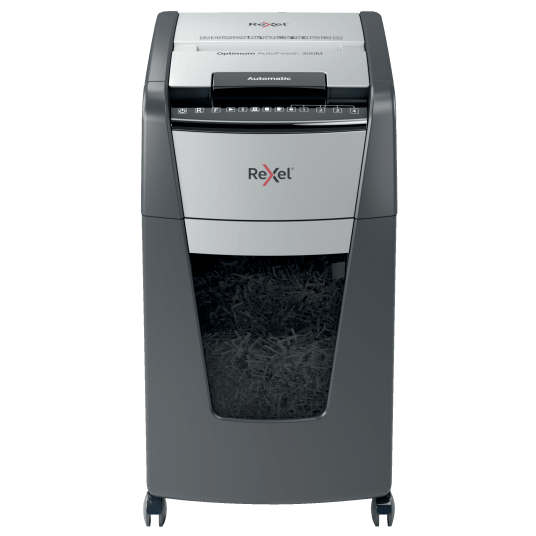 - jednorazowo niszczy automatycznie do 300 kartek A4 (80 gsm), tnąc arkusze na mikrościnki (o wymiarach 2 x 15 mm), co zapewnia poziom bezpieczeństwa P-5