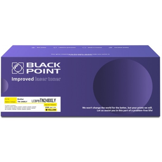 Toner laserowy Black Point LCBPBTN248XLY. Zastępuje Brother TN-248XLY. Kolor: żółty. Wydajność: 2300 str. (ISO 19752). Kompatybilny z Brother HL: L3215CW, L3220CW, L3220CWE, L3240CDW, L8230CDW, L8240CDW; DCP: L3515CDW, L3520CDW, L3520CDWE, L3527CDW, L3555CDW, L3560CDW; MFC: L3740CDW, L3740CDWE, L3760CDW, L8340CDW, L8390CDW