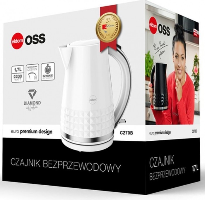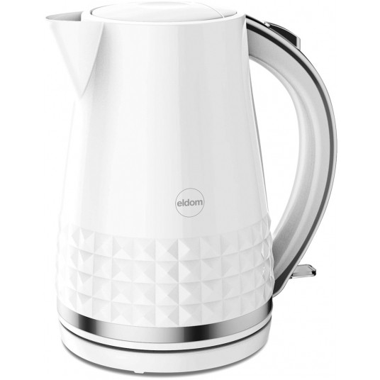 Czajnik Eldom Elli C280C z serii Diamond Collection ma białą obudowę wykonaną z eleganckiego tworzywa sztucznego. Duża pojemność 1.7 l pozwoli na zagotowanie większej ilości wody. Model zasilany jest sieciowo, a elementem grzejnym jest ukryta grzałka. Zaletą jest także filtr antyosadowy. Wysoka moc 2200 W umożliwia szybkie zagotowanie dużej ilości wody, co wpływa na maksymalny komfort użytkowania.