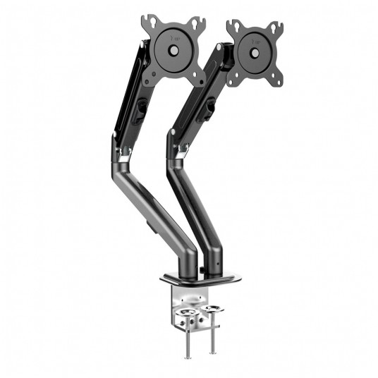 Uniwersalny uchwyt do monitorów LCD lub LED z możliwością montażu do blatu biurka lub stołu. Uchwyt przeznaczony do monitorów od 13" do 27" o maksymalnej wadze po 7 kg dla każdego monitora. Dzięki zastosowaniu sprężyn gazowych, uchwyt umożliwia dostosowanie ekranów do optymalnej wysokości względem poziomu oczu. Takie rozwiązanie wpływa korzystnie na komfort pracy, a także pomaga w zapobieganiu bólowi szyi, pleców i zmęczeniu wzroku. Przelotki na przewody pomagają w prowadzeniu kabli w uporządkowany sposób. Dzięki temu zmniejsza się bałagan na biurku, co przekłada się na bardziej schludny wygląd i bardziej zorganizowane miejsce pracy. Podany rozmiar ekranu jest tylko propozycją. Na uchwyt można zamontować większy telewizor, gdy nie przekracza maksymalnej wagi oraz mieści się w podanym standardzie VESA. Do uchwytu bez problemu przymocujemy ekran w standardzie VESA: 75x75, 100x100 mm. Lakierowanie proszkowe - kolor czarny