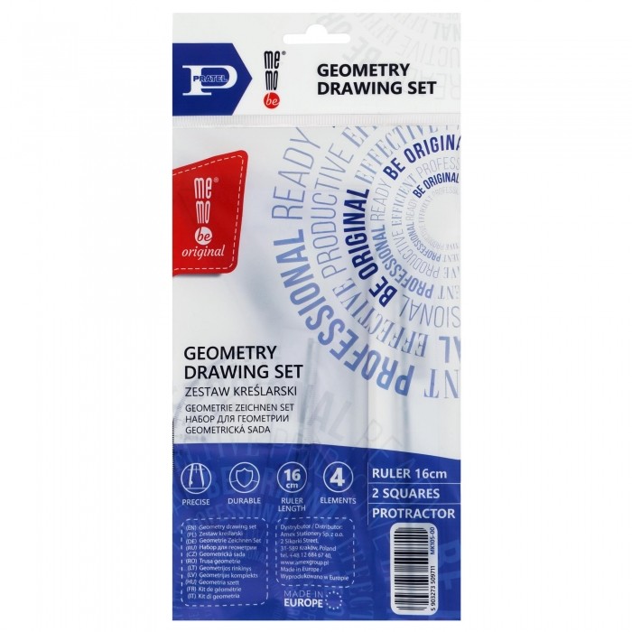 Zestaw kreślarski MemoBe by Pratel. Czteroelementowy szkolny zestaw kreślarski. W każdym zestawie 2 standardowe przezroczyste ekierki 16 cm 45/60 stopni, kątomierz 10 cm/180 stopni oraz linijka 16 cm.Elementy zestawu posiadają trwałą nieścieralną podziałkę i zaokrąglone rogi dla bezpieczeństwa użytkownika. Precyzyjny nadruk skali (do 0,001 cm). Wykonane z plastiku o odpowiednim stosunku twardości do elastyczności zapewniającym wysoką odporność na złamania. Pakowane w woreczki z zawieszką.