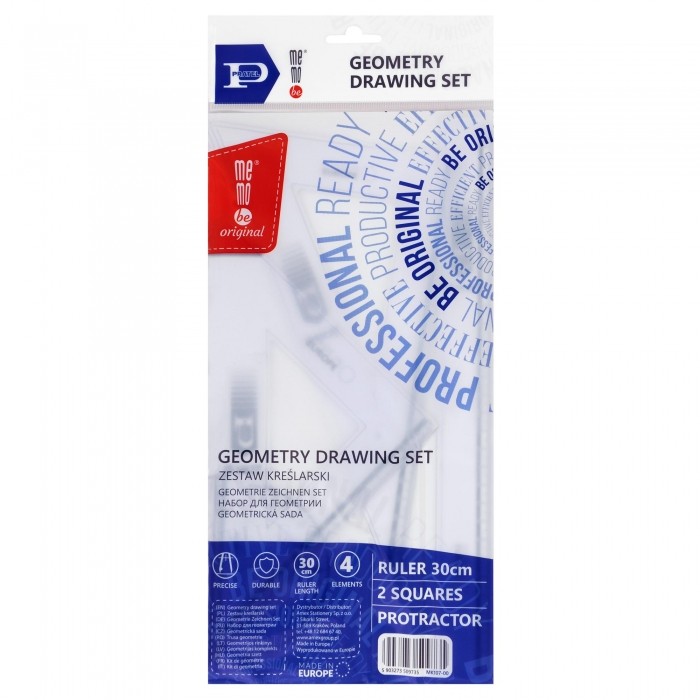 Zestaw kreślarski MemoBe by Pratel. Czteroelementowy szkolny zestaw kreślarski. W każdym zestawie 2 standardowe przezroczyste ekierki 16 cm 45/60 stopni, kątomierz 10 cm/180 stopni oraz linijka 30 cm.Elementy zestawu posiadają trwałą nieścieralną podziałkę i zaokrąglone rogi dla bezpieczeństwa użytkownika. Precyzyjny nadruk skali (do 0,001 cm). Wykonane z plastiku o odpowiednim stosunku twardości do elastyczności zapewniającym wysoką odporność na złamania. Pakowane w woreczki z zawieszką.
