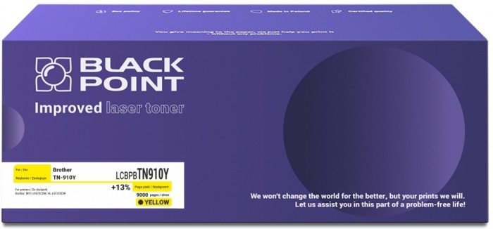 Toner laserowy Black Point LCBPBTN910Y. Zastępuje Brother TN-910Y. Kolor: żółty. Wydajność: 9000 str. (ISO 19752). Kompatybilny z Brother: HL-L9310CDW, MFC-L9570CDW.